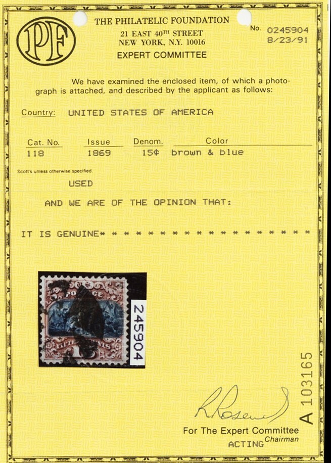 Due to the high cost of obtaining certificates we will only refund the cost of the stamp and not the cost of the certificate for stamps that sell for less than $250 that come back with a negative certificate. Stamps that sell for above $250 will receive a full refund for both the price of the stamp and cost of the certificate if it should come back not as described. For U.S. stamps only certificates from either APS, PSE or from the Philatelic Foundation are accepted, however "graded" certificates or "encased" items are not accepted.