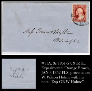 A stunner #11A, U.S. 3¢ 1851-57, plated as 91R1L, bottom row copy with left sheet margin, 4 margins, Relief B, color confirmed as Experimental Orange Brown (EOB), signed by noted expert W. Wilson Hulme on reverse, confirming color as EOB.