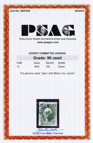 13, Used 10¢ XF GEM - With Graded 90 PSAG Certificate * Stuart Katz
