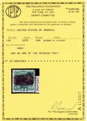 Due to the high cost of obtaining certificates we will only refund the cost of the stamp and not the cost of the certificate for stamps that sell for less than $250 that come back with a negative certificate. Stamps that sell for above $250 will receive a full refund for both the price of the stamp and cost of the certificate if it should come back not as described. For U.S. stamps only certificates from either APS, PSE or from the Philatelic Foundation are accepted, however "graded" certificates or "encased" items are not accepted.
