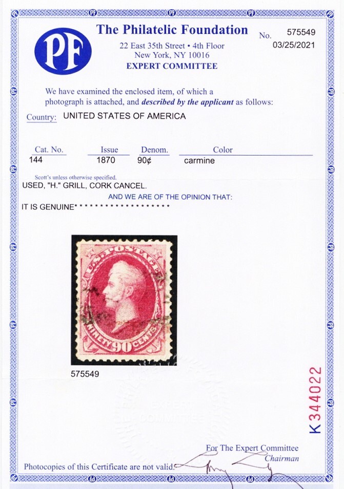 144, Used 90¢ VF And RARE - Light Cancel - PFC Certificate - Stuart Katz