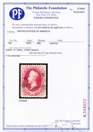 Due to the high cost of obtaining certificates we will only refund the cost of the stamp and not the cost of the certificate for stamps that sell for less than $250 that come back with a negative certificate. Stamps that sell for above $250 will receive a full refund for both the price of the stamp and cost of the certificate if it should come back not as described. For U.S. stamps only certificates from either APS, PSE or from the Philatelic Foundation are accepted, however "graded" certificates or "encased" items are not accepted.