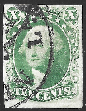 Scott #15 VF Used copy of the Type III (Design is broken at top over the label and the X numerals) 10-cent Green Washington imperf from the 1st large series of stamps issued by the post office in 1851-57. Neat CDS cancels. This stamp is fault free and extremely fresh. No Problems.  Scott catalog value is:$160.00.