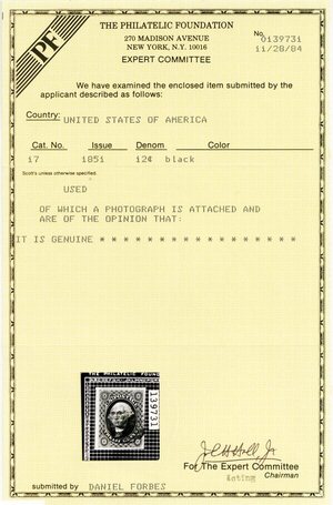 Due to the high cost of obtaining certificates we will only refund the cost of the stamp and not the cost of the certificate for stamps that sell for less than $250 that come back with a negative certificate. Stamps that sell for above $250 will receive a full refund for both the price of the stamp and cost of the certificate if it should come back not as described. For U.S. stamps only certificates from either APS, PSE or from the Philatelic Foundation are accepted, however "graded" certificates or "encased" items are not accepted.