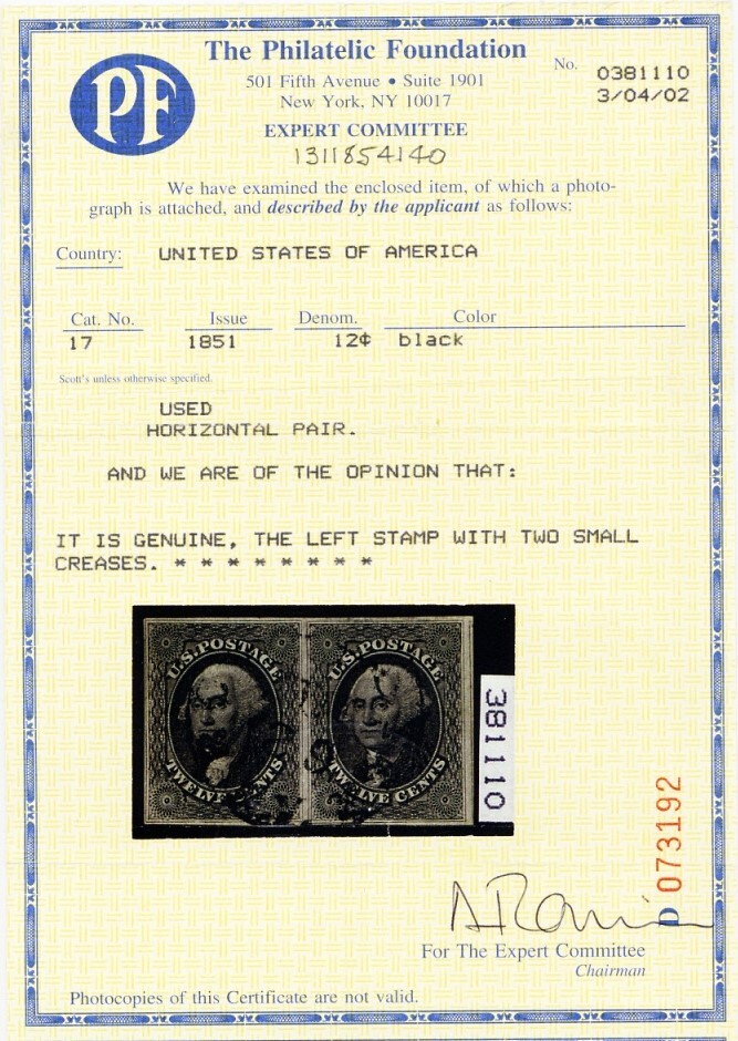 17, Used XF-Superb 12¢ Pair With PFC Certificate "READ CERT" * Stuart Katz