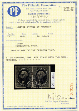 Due to the high cost of obtaining certificates we will only refund the cost of the stamp and not the cost of the certificate for stamps that sell for less than $250 that come back with a negative certificate. Stamps that sell for above $250 will receive a full refund for both the price of the stamp and cost of the certificate if it should come back not as described. For U.S. stamps only certificates from either APS, PSE or from the Philatelic Foundation are accepted, however "graded" certificates or "encased" items are not accepted.
