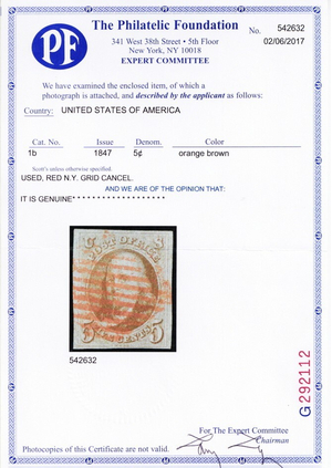Due to the high cost of obtaining certificates we will only refund the cost of the stamp and not the cost of the certificate for stamps that sell for less than $250 that come back with a negative certificate. Stamps that sell for above $250 will receive a full refund for both the price of the stamp and cost of the certificate if it should come back not as described. For U.S. stamps only certificates from either APS, PSE or from the Philatelic Foundation are accepted, however "graded" certificates or "encased" items are not accepted.