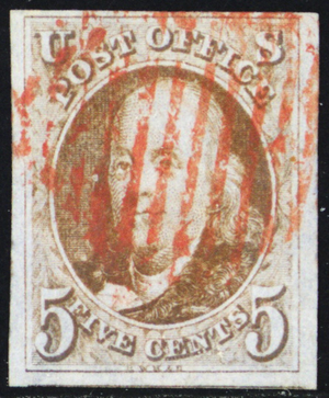 1b, Used VF/XF 5¢ Red Cancel - With Certificate * Stuart Katz