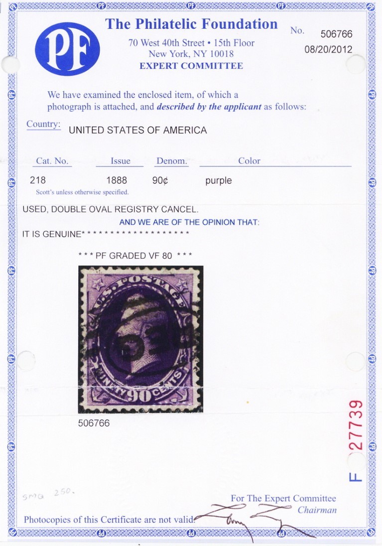 218, Used 90¢ VF With Clean PFC Graded Certificate - Stuart Katz