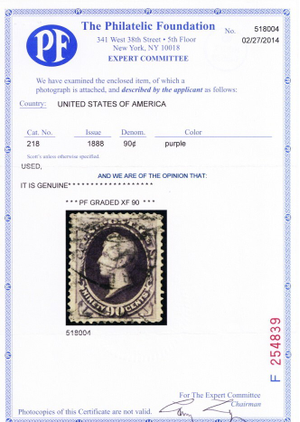 218, Used 90¢ XF Centering - With PFC Graded 90 Certificate * Stuart Katz