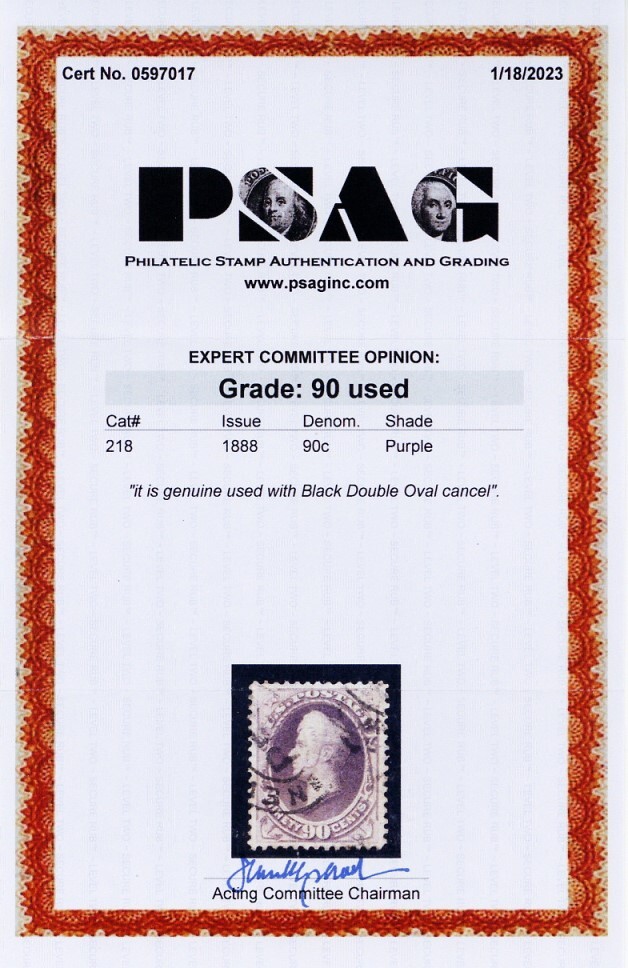 218, Used XF 90¢ With PSAG Graded 90 Certificate SCV $675 Stuart Katz