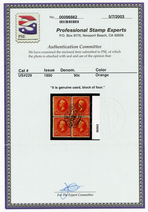 229, Used 90¢ RARE Block of Four With PSE Certificate CV $775.00 * Stuart Katz