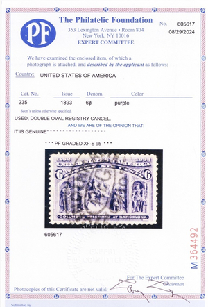 235, Used XF/Superb 6¢ With Graded 95 PFC Certificate - Stuart Katz