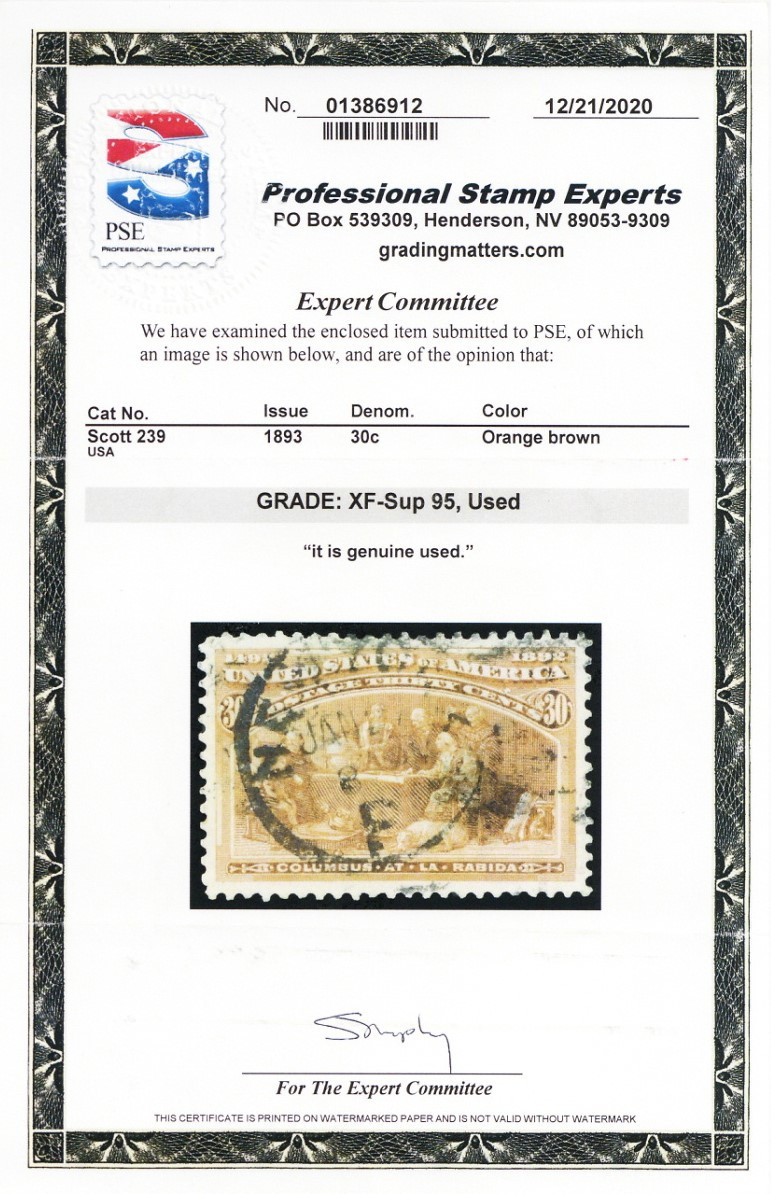 239, Used XF/Superb 30¢ - With Graded 95 PSE Certificate * Stuart Katz