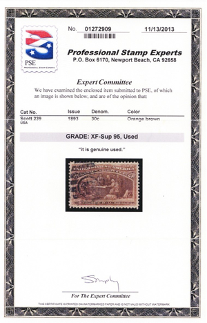 239, Used XF/Superb 30¢ - With Graded 95 PSE Certificate - Stuart Katz