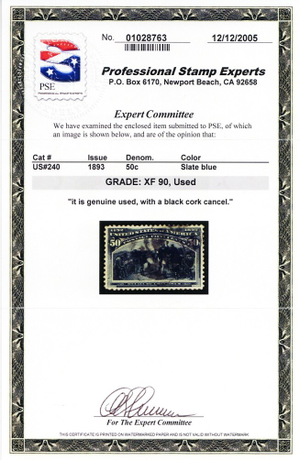 Due to the high cost of obtaining certificates we will only refund the cost of the stamp and not the cost of the certificate for stamps that sell for less than $250 that come back with a negative certificate. Stamps that sell for above $250 will receive a full refund for both the price of the stamp and cost of the certificate if it should come back not as described. For U.S. stamps only certificates from either APS, PSE or from the Philatelic Foundation are accepted, however "graded" certificates or "encased" items are not accepted.