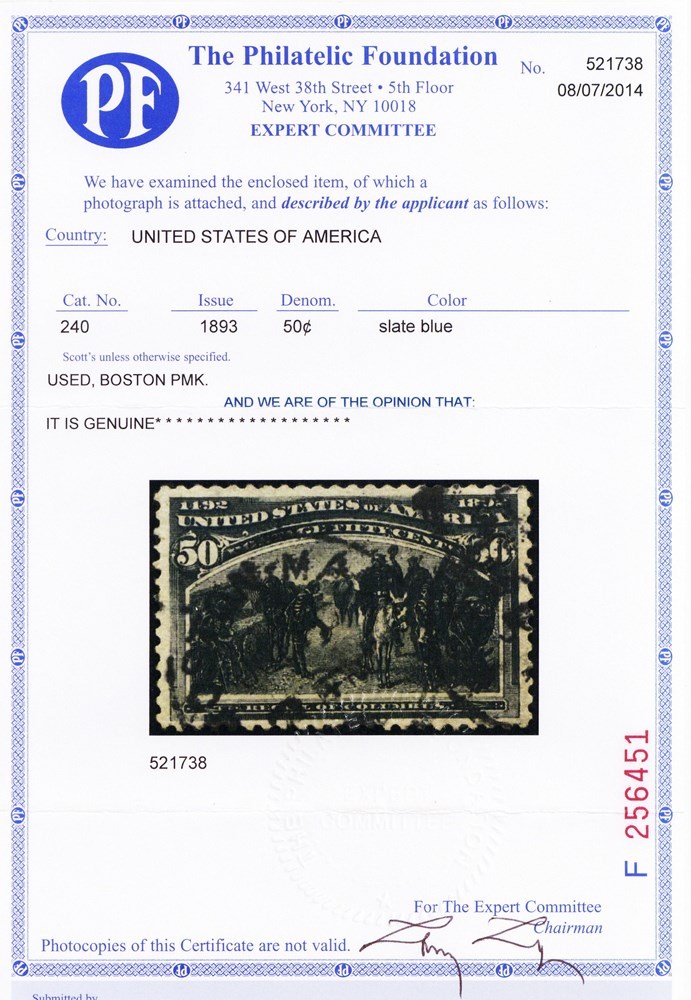 Due to the high cost of obtaining certificates we will only refund the cost of the stamp and not the cost of the certificate for stamps that sell for less than $250 that come back with a negative certificate. Stamps that sell for above $250 will receive a full refund for both the price of the stamp and cost of the certificate if it should come back not as described. For U.S. stamps only certificates from either APS, PSE or from the Philatelic Foundation are accepted, however "graded" certificates or "encased" items are not accepted.