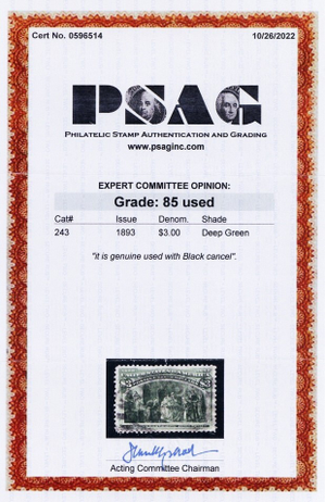 243, Used $3 VF Centering - With PSAG Graded 85 Certificate * Stuart Katz