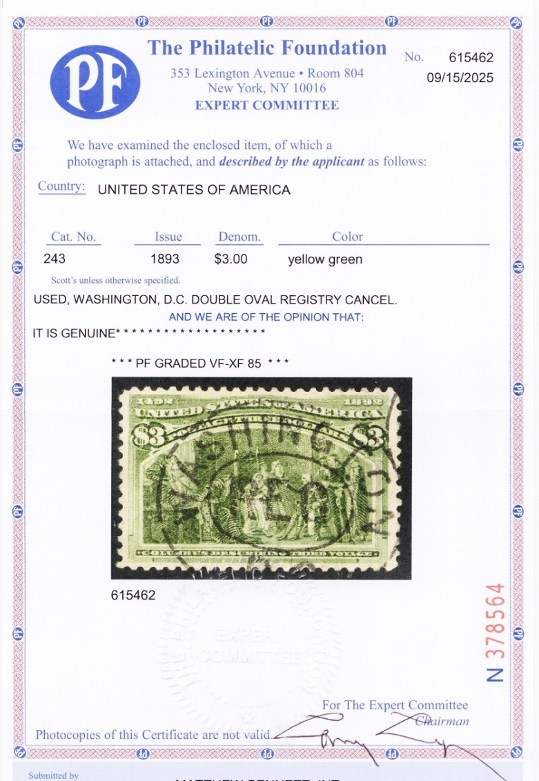 243, Used $3 VF Columbian With Clean PFC Graded 85 Certificate - Stuart Katz