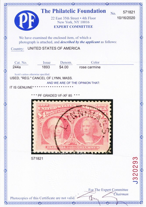 244a, Used $4 VF/XF With CDS "Lynn, MA" Cancel With Graded PFC Cert Stuart Katz