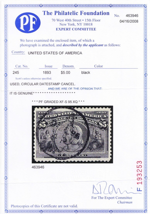 245, Used XF $5 Columbian With PFC Graded 95 XQ Certificate - Stuart Katz