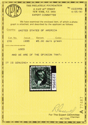 278, Used VF/XF $5 Great Stamp With PFC Certificate* Stuart Katz