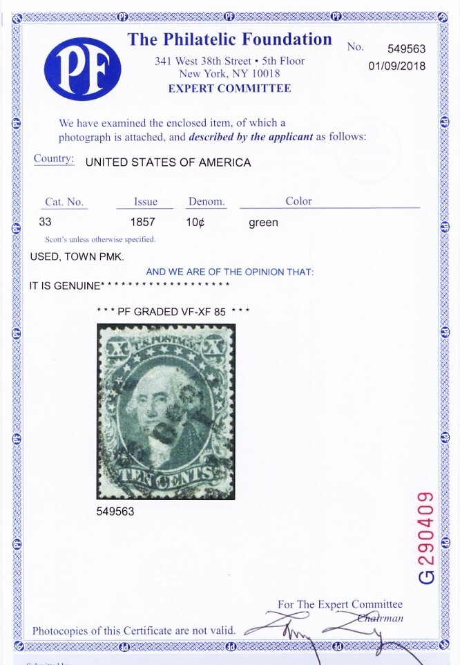 33, Used VF/XF 10¢ GEM - With PFC Graded 85 Certificate * Stuart Katz