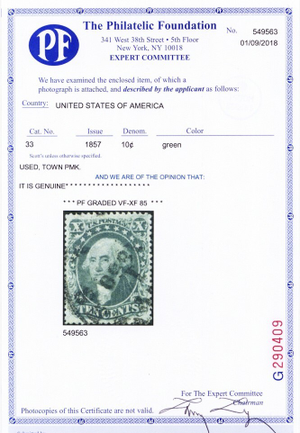 Due to the high cost of obtaining certificates we will only refund the cost of the stamp and not the cost of the certificate for stamps that sell for less than $250 that come back with a negative certificate. Stamps that sell for above $250 will receive a full refund for both the price of the stamp and cost of the certificate if it should come back not as described. For U.S. stamps only certificates from either APS, PSE or from the Philatelic Foundation are accepted, however "graded" certificates or "encased" items are not accepted.