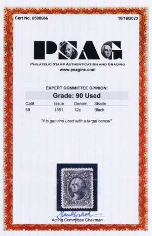 69, Used XF 12¢ - With Graded 90 PSAG Certificate - Stuart Katz