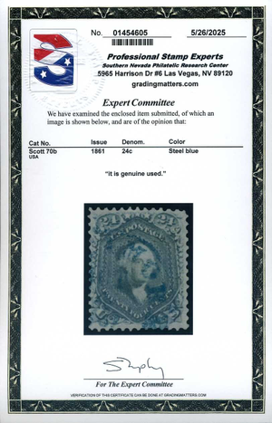70b, 24¢ Steel Blue, Blue Baltimore Postmark, PSE & PF certificates, Scott $850