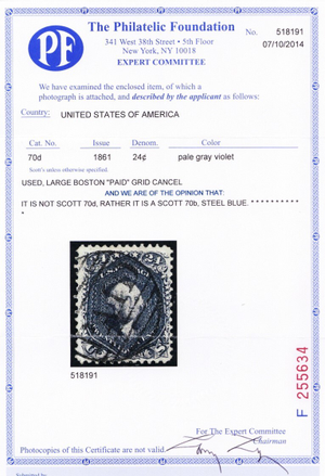 Due to the high cost of obtaining certificates we will only refund the cost of the stamp and not the cost of the certificate for stamps that sell for less than $250 that come back with a negative certificate. Stamps that sell for above $250 will receive a full refund for both the price of the stamp and cost of the certificate if it should come back not as described. For U.S. stamps only certificates from either APS, PSE or from the Philatelic Foundation are accepted, however "graded" certificates or "encased" items are not accepted.