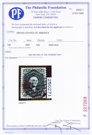 Due to the high cost of obtaining certificates we will only refund the cost of the stamp and not the cost of the certificate for stamps that sell for less than $250 that come back with a negative certificate. Stamps that sell for above $250 will receive a full refund for both the price of the stamp and cost of the certificate if it should come back not as described. For U.S. stamps only certificates from either APS, PSE or from the Philatelic Foundation are accepted, however "graded" certificates or "encased" items are not accepted.