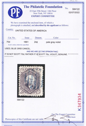 70c, Used 24¢ Violet Shade Blue Cancel PFC Certificate CV $2,300.00 Stuart Katz