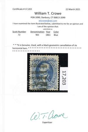 72, Used VF 90¢ - Very Well Centered - With Crowe Certificate - Stuart Katz