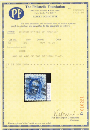 Due to the high cost of obtaining certificates we will only refund the cost of the stamp and not the cost of the certificate for stamps that sell for less than $250 that come back with a negative certificate. Stamps that sell for above $250 will receive a full refund for both the price of the stamp and cost of the certificate if it should come back not as described. For U.S. stamps only certificates from either APS, PSE or from the Philatelic Foundation are accepted, however "graded" certificates or "encased" items are not accepted.