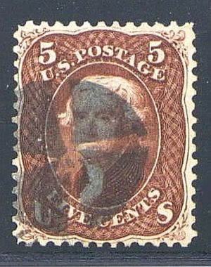 Scott #75 XF Used copy of the 1862 5¢ RED BROWN COLOR Thomas Jefferson. Very fresh stamp with Nice fancy cancel. Excellent centering especially for this series. Scott catalog Value: $550.00. BUY IT NOW!!