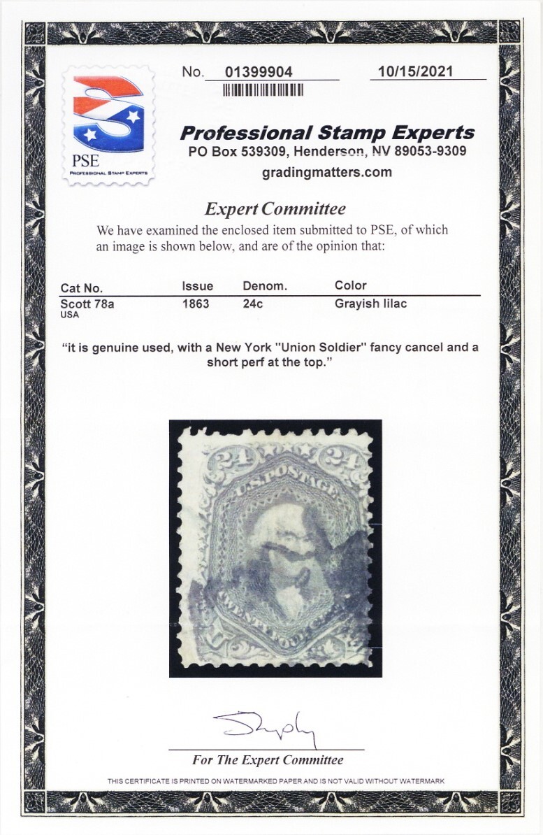 Due to the high cost of obtaining certificates we will only refund the cost of the stamp and not the cost of the certificate for stamps that sell for less than $250 that come back with a negative certificate. Stamps that sell for above $250 will receive a full refund for both the price of the stamp and cost of the certificate if it should come back not as described. For U.S. stamps only certificates from either APS, PSE or from the Philatelic Foundation are accepted, however "graded" certificates or "encased" items are not accepted.
