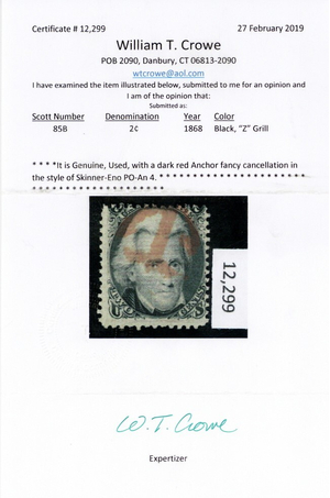 85B, Used 2¢ Dark Red Anchor Fancy Cancel With Certificate - Stuart Katz