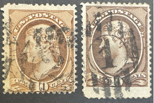 The product is two used 10 cent postage stamps from the United States, issued between 1881-1890. These brown stamps are ungraded and uncertified, making them a unique addition to any stamp collection. The Scott #209 and #209B stamps are a valuable piece of history from the late 19th century, perfect for stamp enthusiasts looking for vintage and authentic pieces.