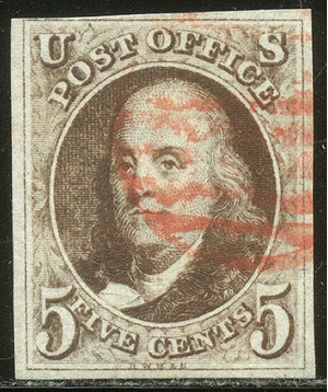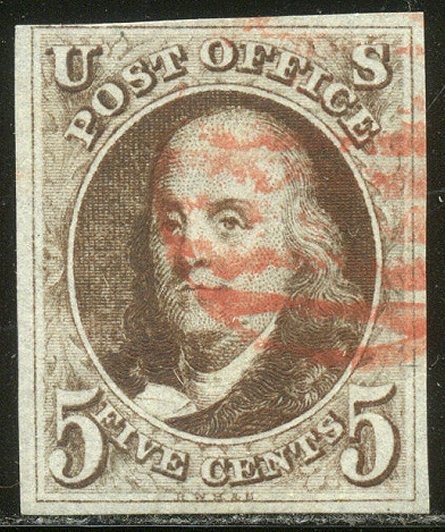 Scott #1: 1847 5c Red Brown Centering & Condition: Used. Fresh. Large margins to close at top left. Pretty #1. Reverse (Gum Side): N/A Faults / Imperfections: None The item pictured is the actual item you are purchasing, unless otherwise noted. I also offer an interest-free layaway plan. Ask me about it!" All items purchased will be mailed a day or two after payment is received. --------------------------------------------------------------------------------