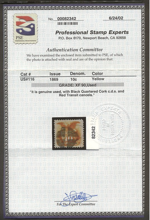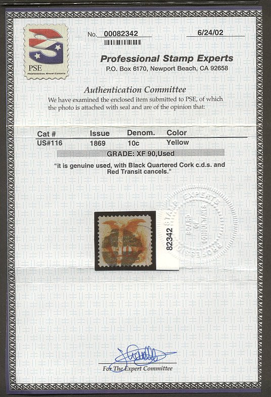 Scott #116: 1869 10c Eagle Centering & Condition: Used. Extremely Fine and CHOICE! A Graded (90) PSE Certificate accompanies. Reverse (Gum Side): N/A Faults / Imperfections: None The item pictured is the actual item you are purchasing, unless otherwise noted. I also offer an interest-free layaway plan. Ask me about it!" All items purchased will be mailed a day or two after payment is received. --------------------------------------------------------------------------------