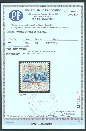 Scott #118: 1869 15c Pictorial, Type I Centering & Condition: Used. Very Fine and lightly cancelled. A Foundation certificate accompanies. Reverse (Gum Side): N/A Faults / Imperfections: None The item pictured is the actual item you are purchasing, unless otherwise noted. I also offer an interest-free layaway plan. Ask me about it!" All items purchased will be mailed a day or two after payment is received. --------------------------------------------------------------------------------