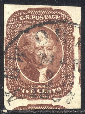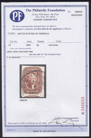 Scott #12: 5c Red Brown Centering & Condition: Used. Rich color. VF/XF and CHOICE example showing parts of next stamps on 2 sides. A Foundation certificate accompanies. Reverse (Gum Side): N/A Faults / Imperfections: None The item pictured is the actual item you are purchasing, unless otherwise noted. I also offer an interest-free layaway plan. Ask me about it!" All items purchased will be mailed a day or two after payment is received. --------------------------------------------------------------------------------