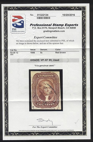 Scott #12: 12c Black, Imperf Centering & Condition: Used. Rich color. VF/XF as graded by the accompanying PSE Certificate. Reverse (Gum Side): N/A Faults / Imperfections: None The item pictured is the actual item you are purchasing, unless otherwise noted. I also offer an interest-free layaway plan. Ask me about it!" All items purchased will be mailed a day or two after payment is received. --------------------------------------------------------------------------------