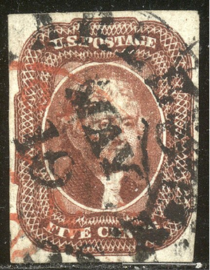 Scott #12: 5c Red Brown Centering & Condition: Used. Very Fine with Red and Black. A Foundation certificate accompanies.. Reverse (Gum Side): N/A Faults / Imperfections: None The item pictured is the actual item you are purchasing, unless otherwise noted. I also offer an interest-free layaway plan. Ask me about it!" All items purchased will be mailed a day or two after payment is received. --------------------------------------------------------------------------------