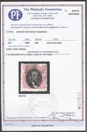 Scott #122: 1869 90c Pictorial Centering & Condition: Used. Very Fine. A Foundation Certificate accompanies. Pretty stamp! Reverse (Gum Side): N/A Faults / Imperfections: Tiny sealed perf tear The item pictured is the actual item you are purchasing, unless otherwise noted. I also offer an interest-free layaway plan. Ask me about it!" All items purchased will be mailed a day or two after payment is received. --------------------------------------------------------------------------------