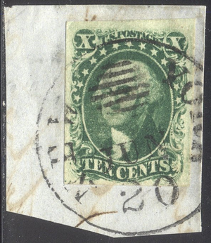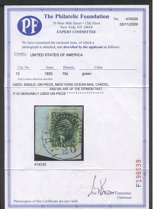 Scott #13: 10c Green, Type I Centering & Condition: Used. Very fine example tied to piece. A Foundation certificate accompanies. Reverse (Gum Side): N/A Faults / Imperfections: None The item pictured is the actual item you are purchasing, unless otherwise noted. I also offer an interest-free layaway plan. Ask me about it!" All items purchased will be mailed a day or two after payment is received. --------------------------------------------------------------------------------