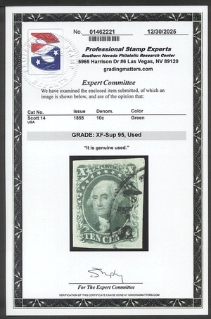 Scott #14: 10c Green, Type II Centering & Condition: Used. Large Margins. XF/SUP.A Graded (95) PSE Certificate accompanies. Reverse (Gum Side): N/A Faults / Imperfections: None The item pictured is the actual item you are purchasing, unless otherwise noted. I also offer an interest-free layaway plan. Ask me about it!" All items purchased will be mailed a day or two after payment is received. --------------------------------------------------------------------------------
