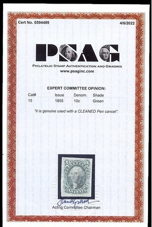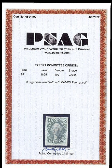 Scott #15: 15c Green, Type III Centering & Condition: Used. SUPERB JUMBO with a partially removed pen cancel. A PSAG Certificate accompanies. Reverse (Gum Side): N/A Faults / Imperfections: None The item pictured is the actual item you are purchasing, unless otherwise noted. I also offer an interest-free layaway plan. Ask me about it!" All items purchased will be mailed a day or two after payment is received. --------------------------------------------------------------------------------