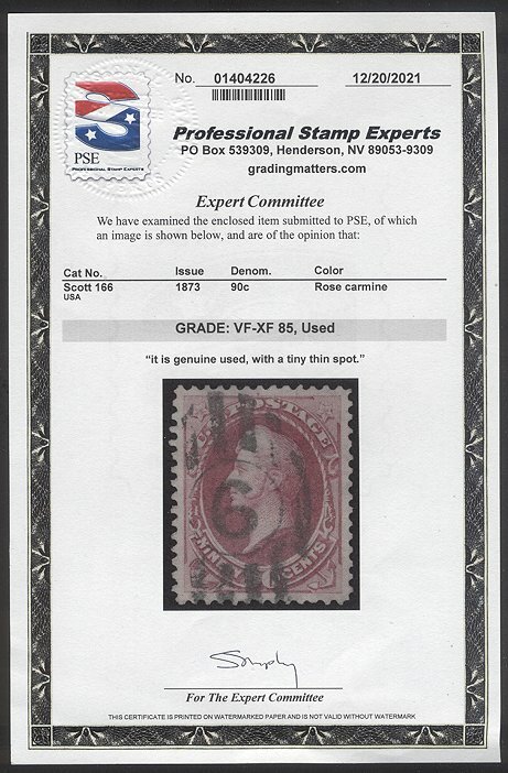 Scott #166: 90c Rose Carmine Centering & Condition: Used. Extremely Fine and CHOICE appearing stamp with large margins. A PSE certificate accompanies noting a tiny thin (bringing down the grade to a VF/XF 85). Still, a gorgeous looking stamp! Reverse (Gum Side): N/A Faults / Imperfections: Tiny thin The item pictured is the actual item you are purchasing, unless otherwise noted. I also offer an interest-free layaway plan. Ask me about it!" All items purchased will be mailed a day or two after payment is received. --------------------------------------------------------------------------------